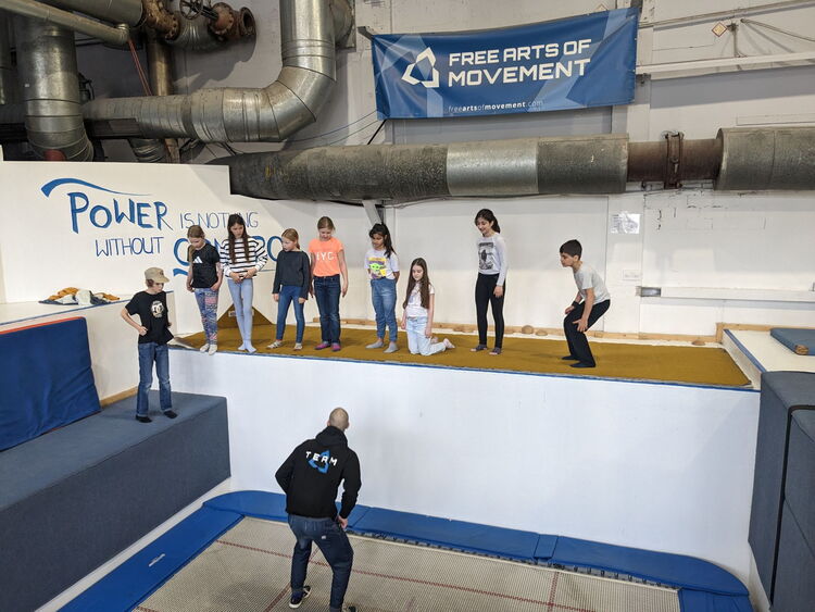 Hier lernen die Kinder auf professionellen Riesentramps alle Grundsprünge am Trampolin. Anschließend werden Backflips und Frontflips und Schrauben gelernt.