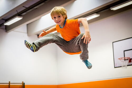 Hier kannst du dich sowohl auf dem Trampolin als auch auf der Airtrack austoben.