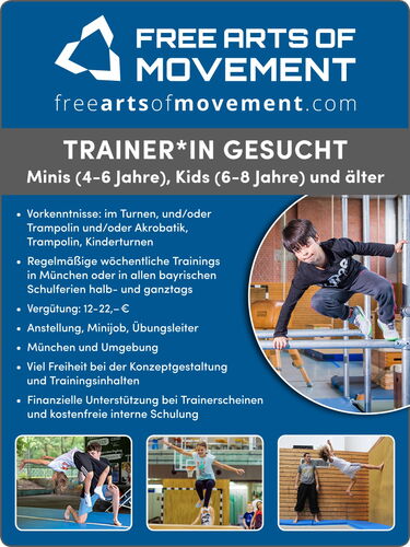 Wir bilden aus! Du hast Interesse an Parkour, Trampolin, Ninja Warrior oder Freestyle Turnen und möchtest deine Leidenschaft zum Beruf machen? Wir freuen uns über deine aussagekräftige Bewerbung an jomo@freeartsofmovement.com